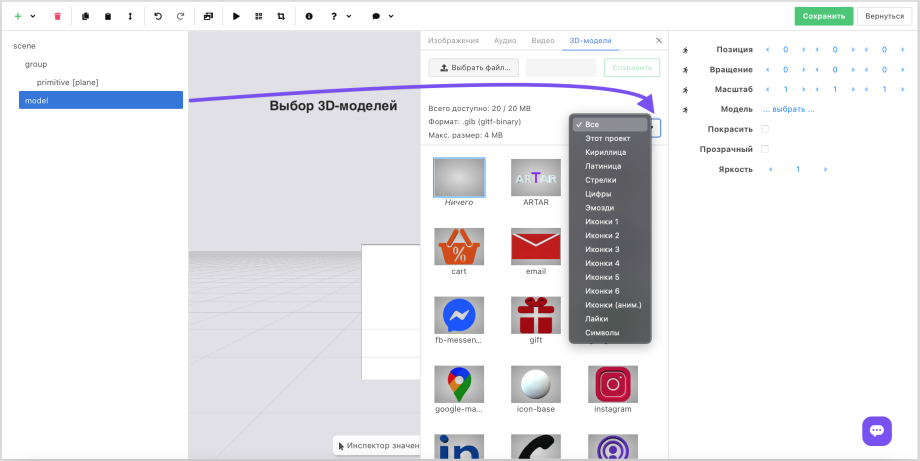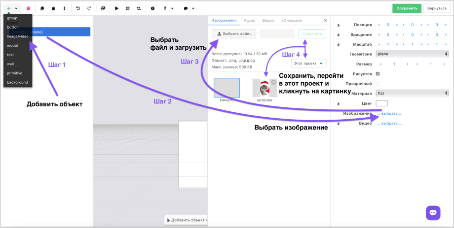 To add an image, video, or 3D model, you need to add the corresponding object, upload a file from your computer or select one from those available in the builder and click on it.