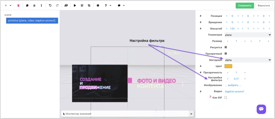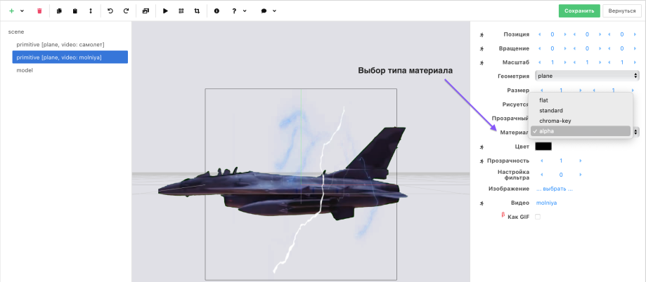 Four types of material are available in the editor: - flat – "plain background"; - standard – applies highlights and shadows to the image; - chroma-key – used to remove a real green or blue background filmed on video; - alpha – for removing a background created in a video editor. Perfectly removes a black background. Allows creating fire effects, preserves neon glow when removing the background, and is applicable for other effects.