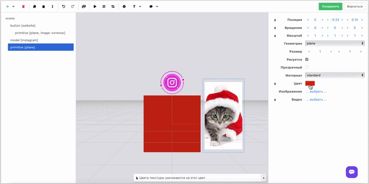 Color. The color picker dialog depends on the browser and operating system, so your color controls may look different. The logic of changing color for different object types is similar, but there are nuances. Video and image are colored the same way. Pixels that are darker compared to the blended color are replaced (multiplied by the image colors and alter it), while pixels that are lighter compared to the blended color remain unchanged. The color information in each channel is considered, and the resulting color is chosen as either the base or blended color depending on which is lighter. Thus, white does not recolor the object (leaves it in its original color), black fully recolors it. 3D model. To show the color window you need to check the "Paint" box. To change the color of a model created in Blender, you must include !primary in the material name (for example !primary-white). That is, all materials starting with !primary will be painted with one color. Other materials will not be colored. We will improve this soon.