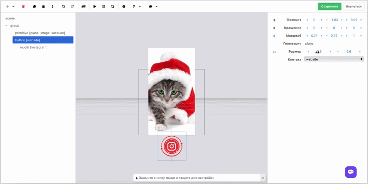 Position, Rotation and Scale. These fields exist for all objects. By default the properties "Position" and "Rotation" are set to 0 0 0. "Scale" has values 1 1 1 and equals the size of the QR code. There are three ways to change the field values: 1. Hover over the field with the value, hold the left mouse button or touchpad and move the cursor left/right (the fastest way). 2. Click the arrows next to the numbers (the smallest possible and precise change). 3. Enter a specific value by changing the number in the corresponding field (a quick and precise option if you know the value you need to change).