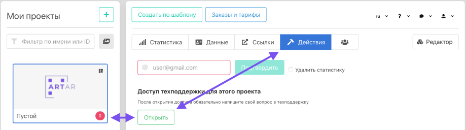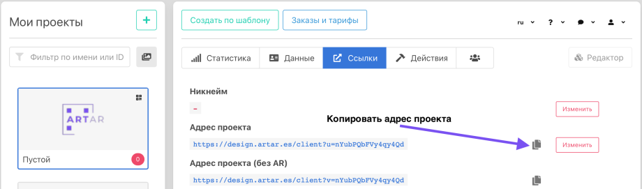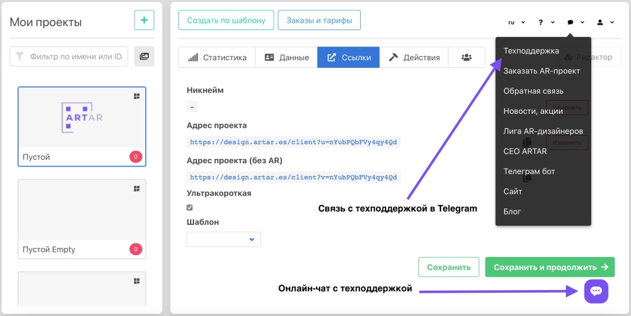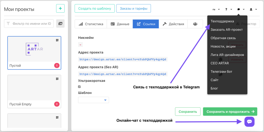 If you need a consultation on a specific project, write the email you used to register on the platform and the address of the project in question. The project address can be copied by going to the "Links" tab.