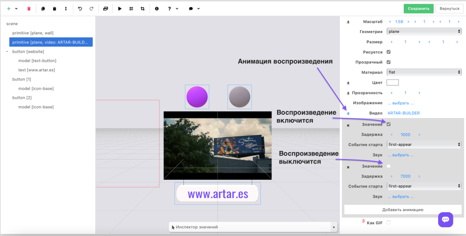 That is, if you need to configure the video's appearance and disappearance, then in addition to animating the object's properties you must add two video animations (play/pause).