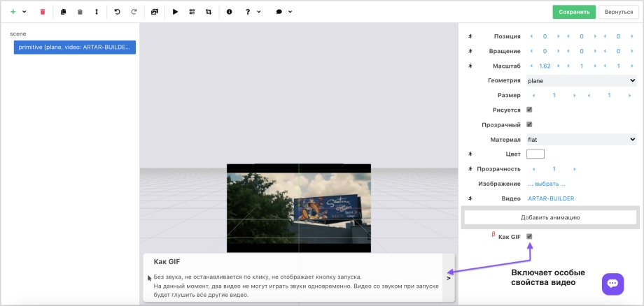 The builder does not support the gif format, but you can convert a gif to mp4 and enable the gif feature in the editor. Video in this mode will play on loop, without sound, and will not have play/pause buttons. Multiple videos are allowed in a single project.