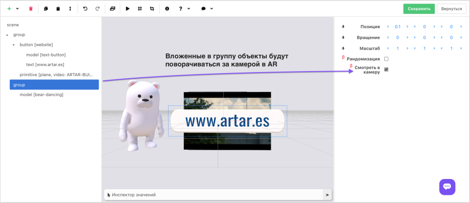 "Look at camera" will allow you to rotate: - the model's eyes toward the camera; - buttons for convenient pressing; - video, for example, a person with the background removed (a hologram).
